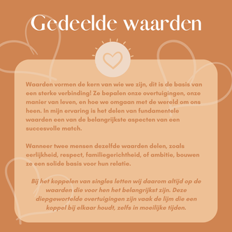 Waarden vormen de kern van wie we zijn, dit is de basis van een sterke verbinding! Ze bepalen onze overtuigingen, onze manier van leven, en hoe we omgaan met de wereld om ons heen. In mijn ervaring is het delen van fundamentele waarden een van de belangrijkste aspecten van een succesvolle match. Wanneer twee mensen dezelfde waarden delen, zoals eerlijkheid, respect, familiegerichtheid, of ambitie, bouwen ze een solide basis voor hun relatie.