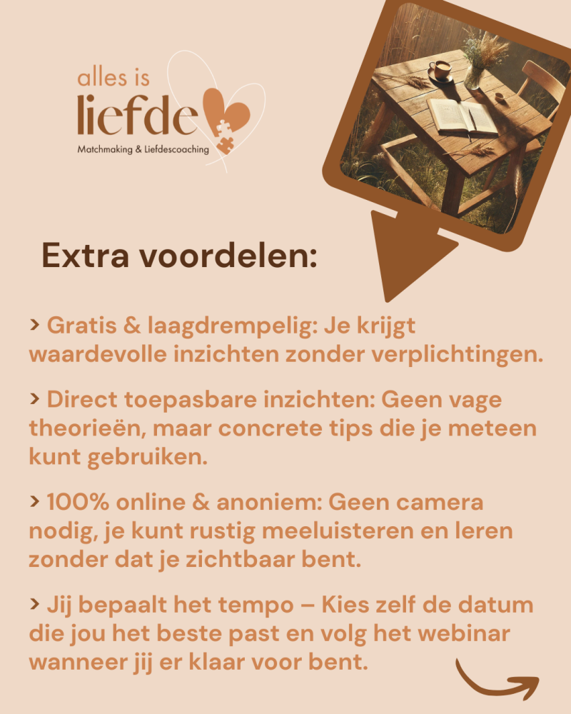 Deze webinar is speciaal voor singles die het zat zijn om steeds tegen dezelfde zaken aan te lopen en klaar zijn om te ontdekken wat hen tegenhoudt in de liefde. Als je wilt weten wie je écht bent, waar je uitdagingen liggen op liefdesvlak, en hoe je deze kunt overwinnen, dan is dit webinar iets voor jou.