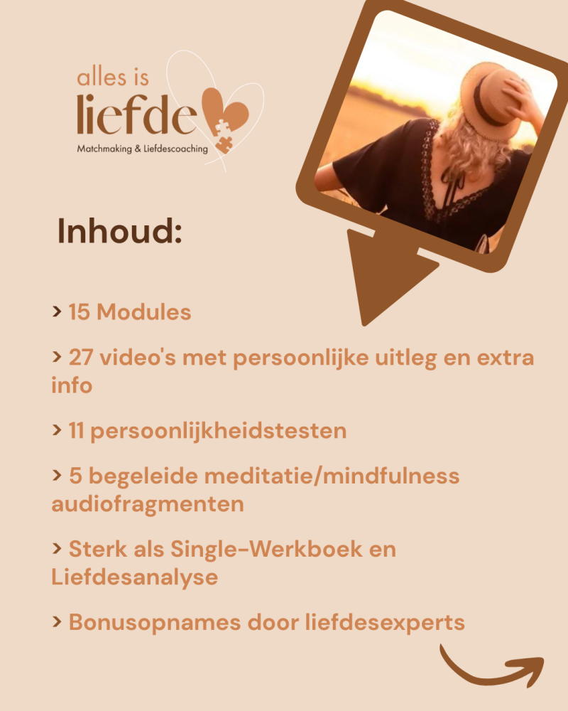 In dit online traject van 15 boeiende modules, nemen we je mee op een reis van zelfontdekking en persoonlijke groei. De modules zijn allemaal ontworpen om jouw inzichten te geven, jezelf uit te diepen en je te helpen groeien, zowel in je persoonlijke leven als in je zoektocht naar liefde. Straal en trek de liefde aan. Doorbreek je eigen liefdesblokkades en patronen zodat de liefde zijn weg kan vinden naar jou.