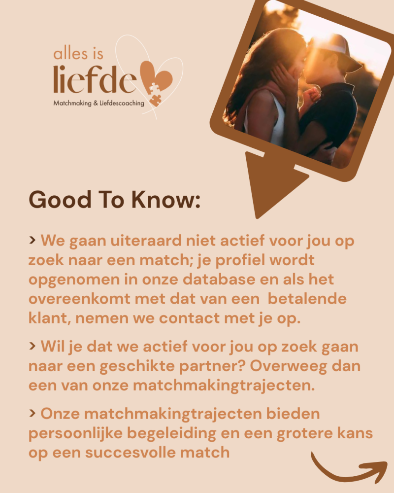 Heb je je zonet ingeschreven? Fantastisch! Welkom bij Alles is Liefde! Je profiel zit nu veilig in onze database, klaar om door ons bekeken te worden wanneer we op zoek gaan naar een mogelijke match voor één van onze betalende trajectklanten.