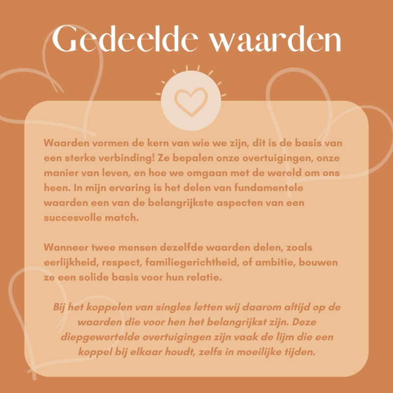 Bij het koppelen van singles letten wij daarom altijd op de waarden die voor hen het belangrijkst zijn. Deze diepgewortelde overtuigingen zijn vaak de lijm die een koppel bij elkaar houdt, zelfs in moeilijke tijden.
