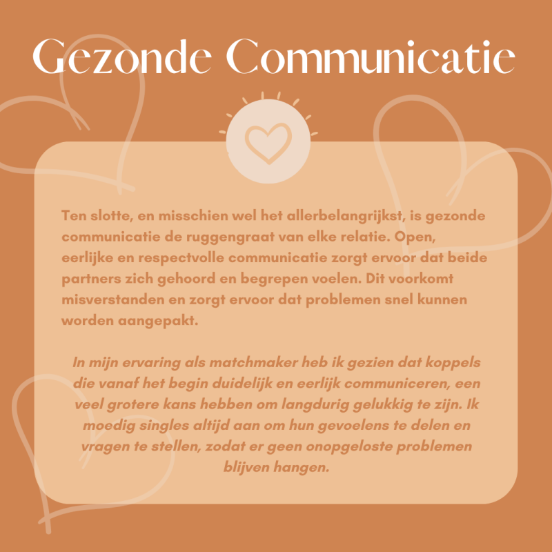 Ten slotte, en misschien wel het allerbelangrijkst, is gezonde communicatie de ruggengraat van elke relatie. Open, eerlijke en respectvolle communicatie zorgt ervoor dat beide partners zich gehoord en begrepen voelen. Dit voorkomt misverstanden en zorgt ervoor dat problemen snel kunnen worden aangepakt.