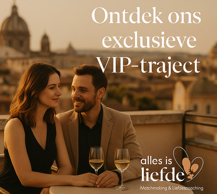 Als je je inschrijft voor het VIP-traject gaan we op alle vlak nog wat dieper te werk om er voor te zorgen dat de kans dat je je ideale partner vindt, nog groter wordt. Dit is een zeer uitgebreid traject met heel hoge slagingspercentages. Hier ligt ook een grote focus op persoonlijke groei, zelfontwikkeling en coaching. Mogelijk vanaf €560/maand.(max.6 betalingen)